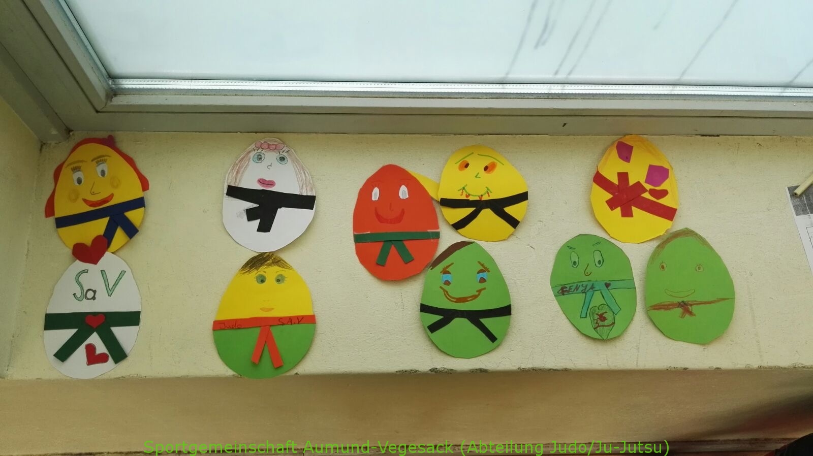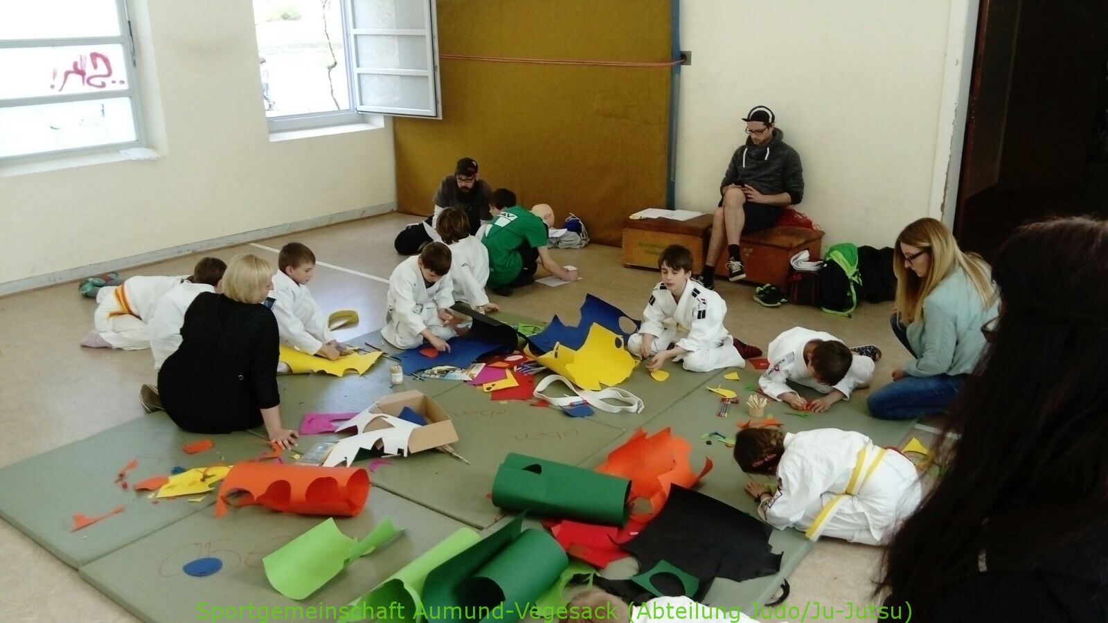 Beim Kreativteil bastelten die jüngeren Judokas Judo-Ostereier. Aus Pappe wurden farbenfrohe Eier gebastelt, welche alle einen Judogürtel umhatten. Besonders beliebt war dabei der schwarze Gürtel, der höchste Gürtel beim Judo. Die älteren Judokas machten ein Quiz zum Thema Judo und grübelten über die richtigen Antworten. Es musste z. B. beantworten wer Judo begründet hat, wie die japanischen Namen einiger Judotechniken sind oder was sinnvolle Techniken in speziellen Situationen sind.